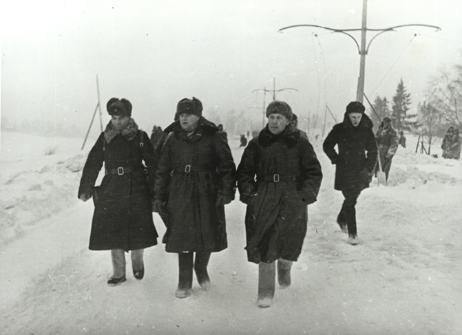 К.А. Мерецков командующий войсками 7 армии с группой сопровождающих его выдвигается на НП при штурме Выборга. Справа крайний В.К. Мерецков. март 1940 г.