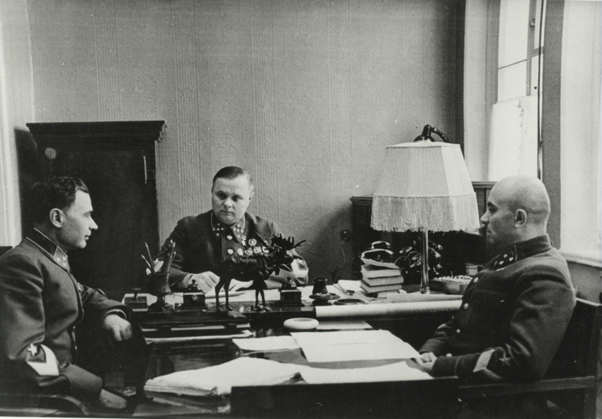 Начальник генерального штаба генерал армии К.А. Мерецков при проведении сборов руководящего состава и военной игры на картах. Слева генерал-лейтенант М.П. Кирпанос,
