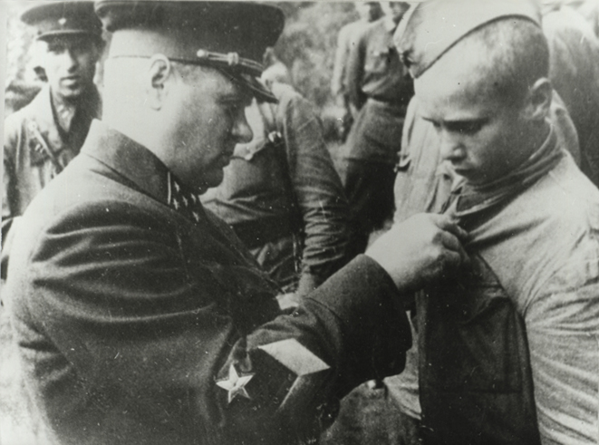 вручает награды в передовых частях отличившихся в бою. 1942. г.