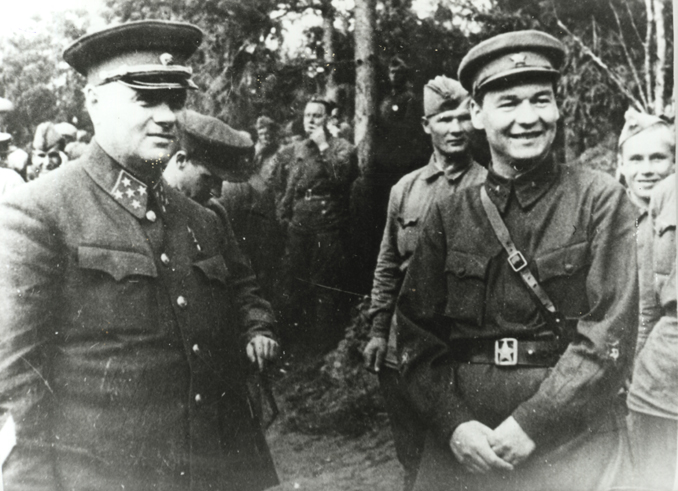 в передовых частях после беседы с офицерами и солдатами. Справа начальник политического управления фронта Калашников 1942 г.