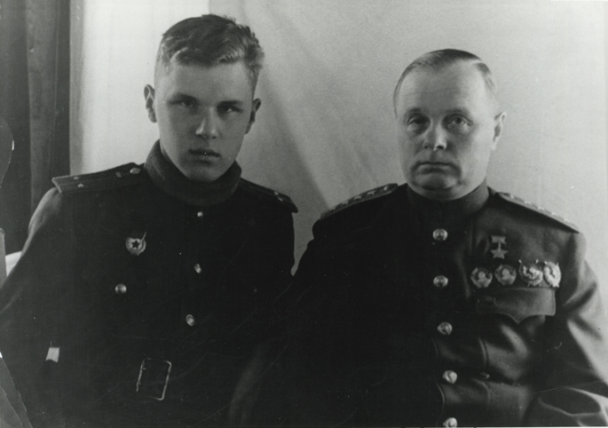 Командующий войсками Волховского фронта генерал-армии К.А. Мерецков с сыном гвардии- лейтенантом В.К. Мерецковым командиром танкового взвода Т-34 7-ой гвардейской танковой бригады, перед прорывом блокады г. Ленинграда.