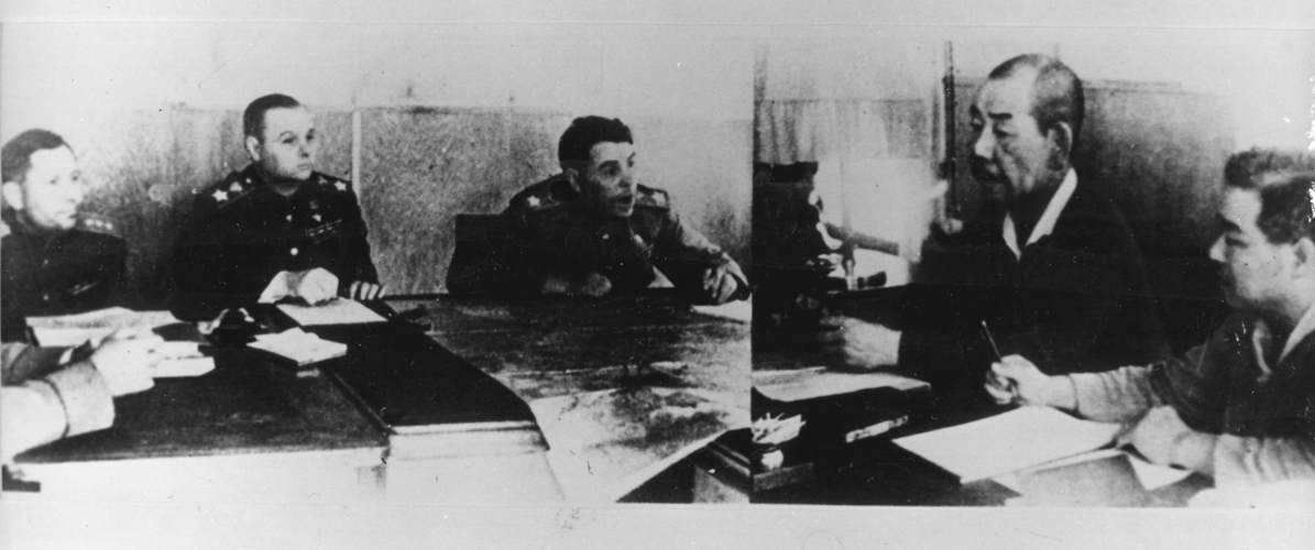 Маршал Советского Союза А.М. Василевский, К.А. Мерецков допрашивают японского генерала Х. Хата - начальника штаба Квантунской армии. 1945 г.