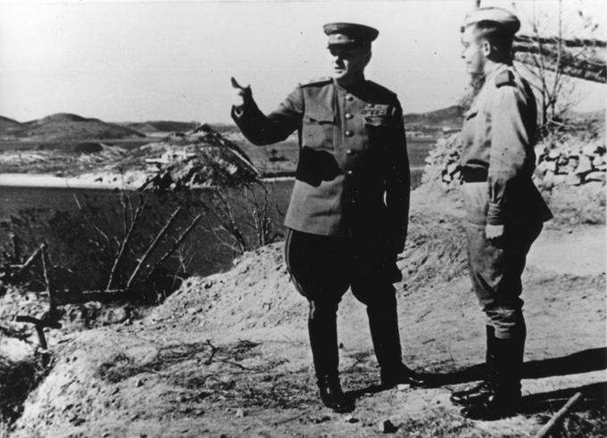 Командующий войсками 1-ого Дальневосточного фронта Маршал Советского Союза К.А. Мерецков беседует с солдатом. Порт- Артур 1945г.