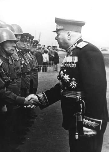 Командующий войсками Приморского военного округа Маршал Советского Союза К.А. Мерецков на параде, поздравляет командиров частей. 7 ноября 1946 г.