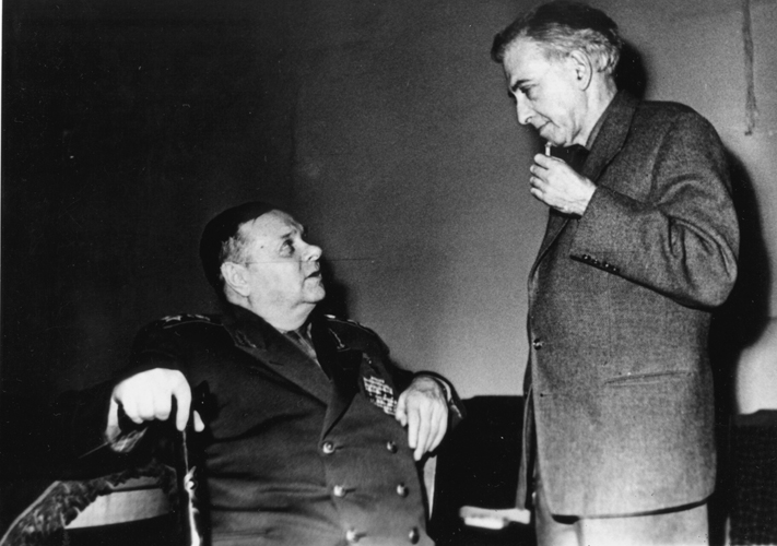 Помощник министра обороны по ВУЗам, председатель комитета ветеранов войны Маршал Советского Союза К.А. Мерецков беседует с писателем И.Г. Эренбургом г. Москва