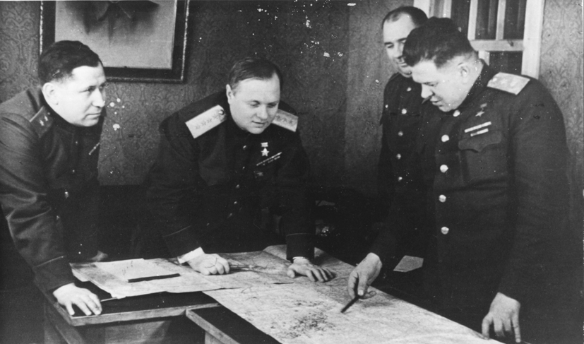 | К.А. Мерецков командующий войсками Волховского фронта за разработкой совместной операции 14 Воздушной армии фронта и дальней  авиации по нанесению ударов по немецко-фашистским войскам в районе Мги. Докладывает командующий  14 ВА Герой Советского Союза генерал-лейтенант авиации  И.П. Журавлев. лето 1943 г. |